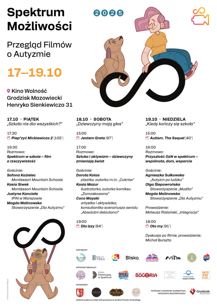 W dniach 17–19 października 2025 w Grodzisku Mazowieckim niedaleko Warszawy odbędzie się Przegląd filmów o autyzmie „Spektrum możliwości”. Autyzm po ludzku z dumą obejmuje patronat nad tym wydarzeniem. Bardzo się cieszę, że na zaproszenie organizatora Stowarzyszenia „Dla Autyzmu”, będę miała okazję uczestniczyć w przeglądzie. W niedzielę 19.10 wspólnie z Olgą Ślepowrońską oraz Magdą Malinowską rozmawiać będziemy po pokazie filmu „Autism. The Sequel” w panelu „Przyszłość OzN w spektrum – wspólnota, dom, wsparcie”. Dyskusję poprowadzi Mateusz Różański. Zapowiada się ciekawa rozmowa 🙂