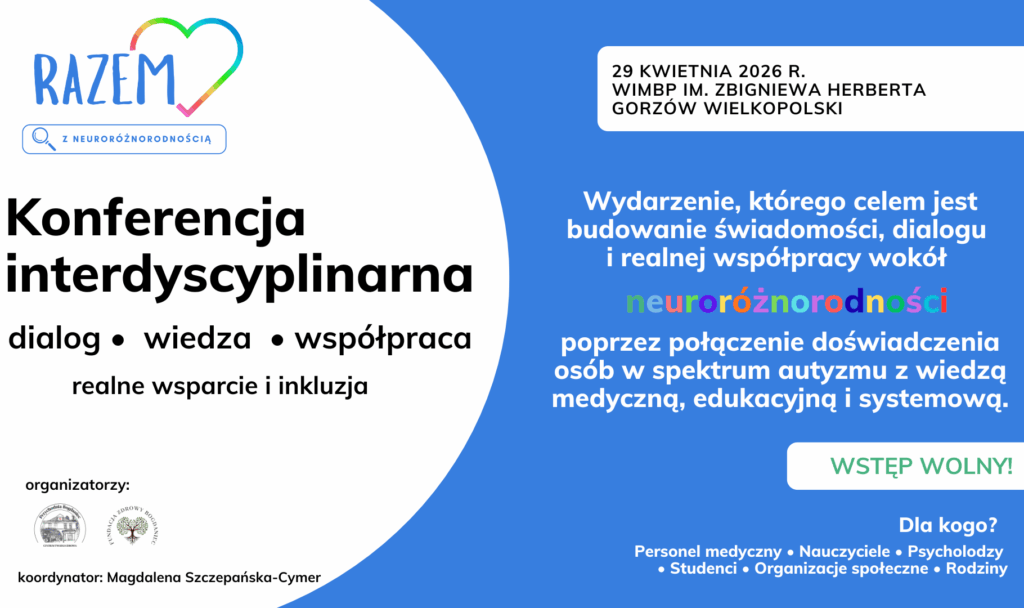 W dniu 29 kwietnia 2026 r. w Wojewódzkiej i Miejskiej Bibliotece Publicznej w Gorzowie Wielkopolskim w godzinach 10:00–14:00 odbędzie się bezpłatna interdyscyplinarna konferencja edukacyjno-społeczna, organizowana przez Przychodnię Bogdaniec i Fundację Zdrowy Bogdaniec, którą Autyzm po ludzku obejmuje swoim patronatem.